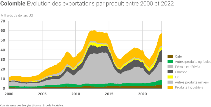 · Le charbon thermique figure parmi les principales exportations de la Colombie, avec près de 56 millions de tonnes expédiées en 2023, principalement vers l’Europe et l’Asie. Le pays occupe ainsi le sixième rang mondial des exportateurs, avec une production concentrée dans le nord, notamment dans les départements de La Guajira et du Cesar. Cette industrie, pourtant stratégique, est régulièrement critiquée pour ses impacts environnementaux et les tensions qu’elle provoque avec les communautés locales. Le pétrole brut constitue l’autre grande ressource du pays : en 2023, ses exportations ont dépassé les 13 milliards de dollars, plaçant la Colombie au 24e rang mondial. Ensemble, le charbon et le pétrole illustrent la dépendance persistante du pays à ses ressources extractives, dans un contexte où les enjeux de durabilité et de transition énergétique deviennent de plus en plus pressants.